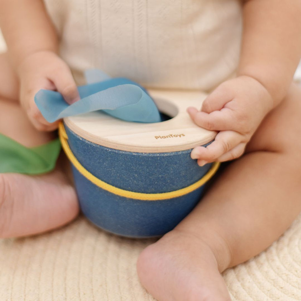 This tactile, travel-friendly toy engages children in pulling, inserting, and exploring with 4 tissues through the holes at the top and bottom, strengthening fine motor skills, hand-eye coordination, and sensory development. It encourages problem-solving, grasping techniques, and introduces cause-and-effect relationships. The bucket is easy to carry, promoting independent play. Set includes: 1 bucket and 4 tissues.
