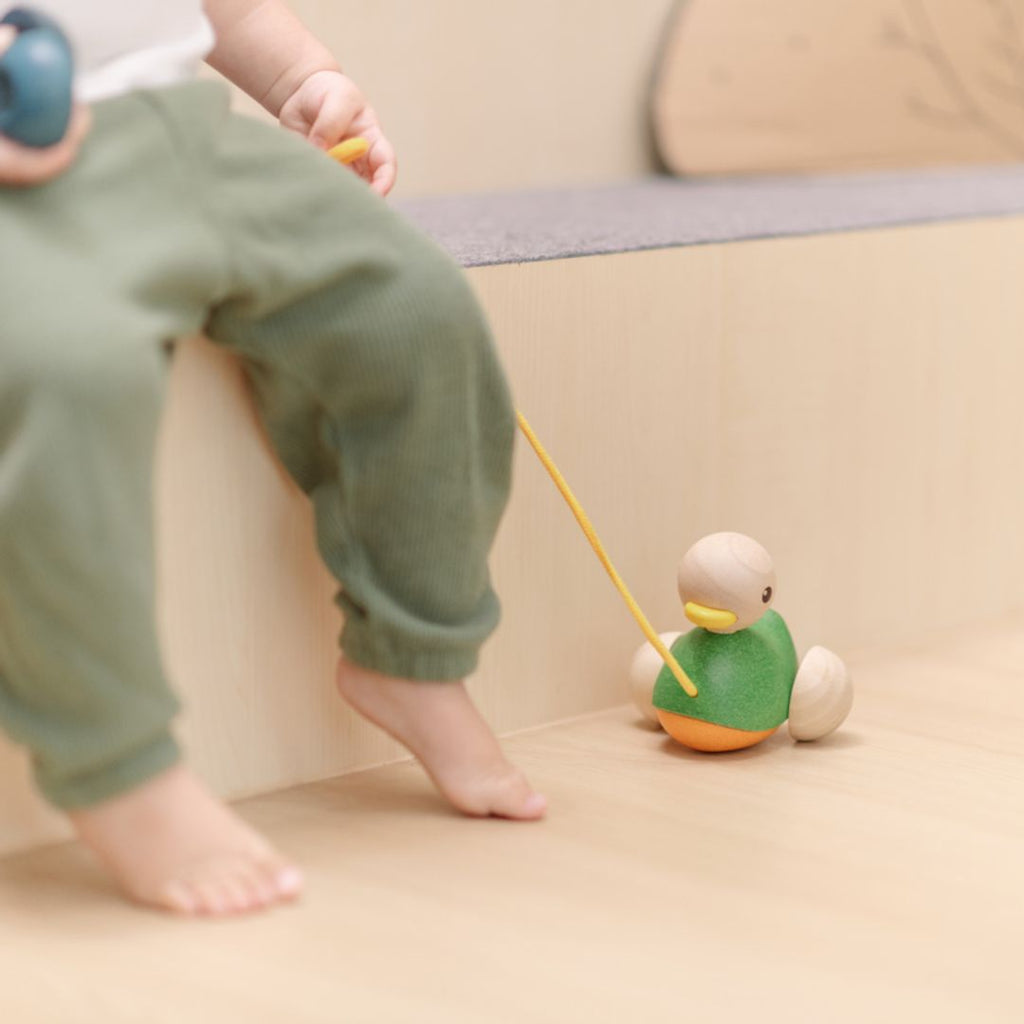 This engaging duck pull toy promotes walking, balance, and coordination, strengthening gross motor skills with its irresistible floppy webbed feet. Pulling the string teaches cause and effect as children watch the duck move. Its interactive nature encourages exploration, experimentation, and builds confidence in movement, sparking imaginative play.